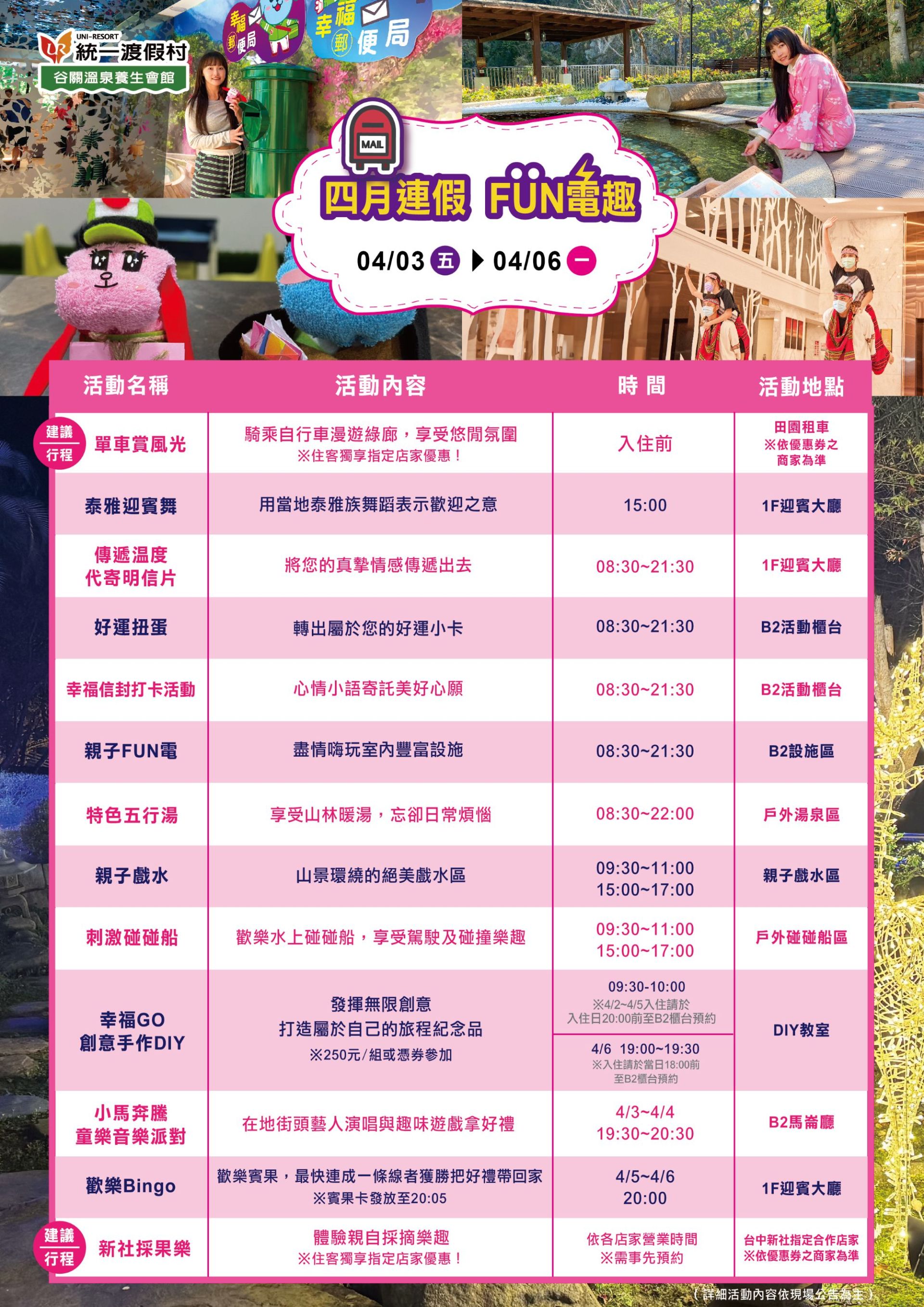 統一谷關【幸福宅急便】精彩活動,連假限定『贈馬告胡椒餅伴手禮』!春暖花開之際泡美湯,感受谷關的慢步調。