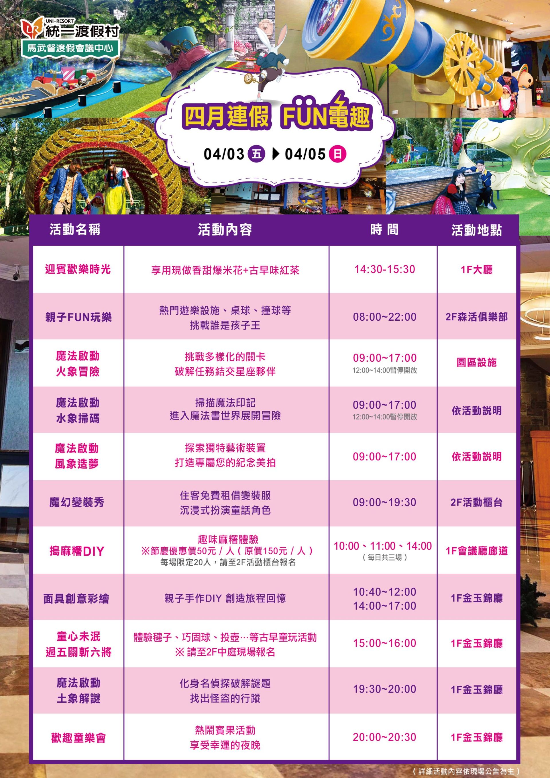 全新四象冒險多層次的玩法,考驗您的各項能力,兒童連假親子共遊快樂放電,從早到晚飯店活動超滿檔~
