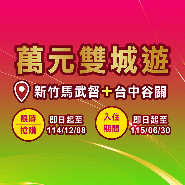 全民普發現金一萬 統一渡假村幫您放大幸福,即日起~2025/12/8預訂【雙城飯店度假之旅】超值兩晚住宿,森林系新竹馬武督+溫泉系台中谷關只要一萬元!新竹馬武督呼吸森林芬多精,暢玩戶外豐富設施+趣味主題闖關,親子入住盡情放電;台中谷關溫泉之旅拋開城市喧囂,沉浸戶外露天湯池,漫步山林美景當中,探訪周遭景點,享受舒心假期~立即預訂雙城之旅,輕鬆體驗兩種不同旅程風景!